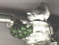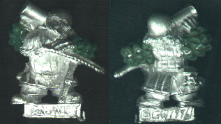 The one to the left above had the initials "WK" engraved in his hammer, by first adding a thin layer of green stuff to it and then carving the letters in the slightly cured putty with a thin needle or sculpting tool. His jacket received another thin layer, so that a couple vertical slashes could be made on either side. You can do the same to the back with horizontal, vertical or diagonal slashes or arranged in a pattern, like 4 tiny slashes in an "X" shape (but don't cut all the way through the center of the cross). |