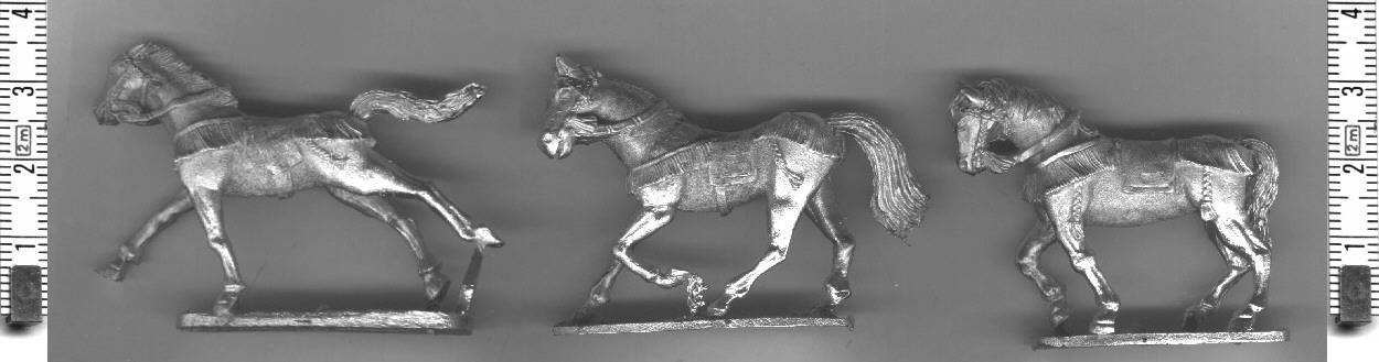for use on horseback, but then at this scale who's going to notice? The riders make only half the figure of course and no mounted Samurai is complete without a worthy horse. There are three horse variants, with one of each pose in eachpack. At a first glance I thought they looked too thin, but now I realise that's because I was used to looking at the more robust horses from other manufacturers. I think the proportions are actualy very nice, especially on the first one. Again the sculptor went the extra mile to add some detail to the reins and other bits. In the picture this can best be seen on the third horse. Nice. Click here to return to the main page of the TAG Gempei Wars miniatures review. Click here to go to the Samurai on foot review. Click here to go to the Monks, Followers and special offer figures review. |
